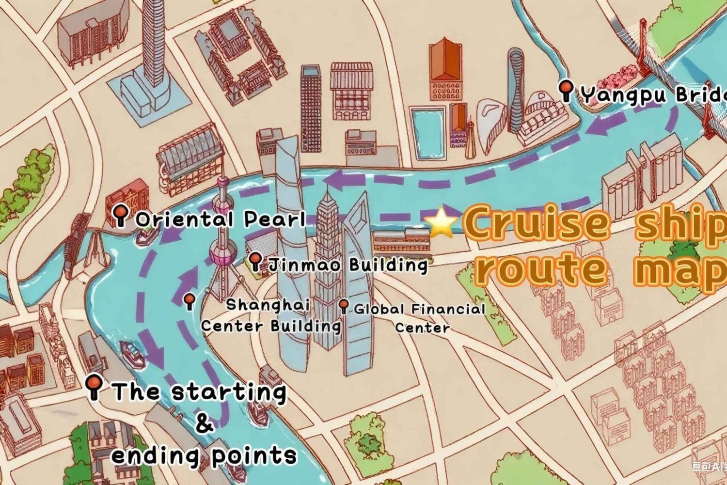 必須のクルーズチケットが必要です。 ルート説明:桟橋を出発 → 楊浦大橋方面 → 上海世界金融センター → 金茂タワー → シャングリ・ラホテル → 上海国際会議センター → 南浦大橋方面 → 東方明珠塔 → 上海国際クルーズターミナル → 外白渡橋 → 上海人民英雄記念塔 → 平和ホテル → 税関 → 上海浦東開発銀行 → 外灘展望台など → 桟橋に戻ります。 具体的な順序や見どころは、出発桟橋により異なる場合があります)。 所要時間:約45分。Important Information
